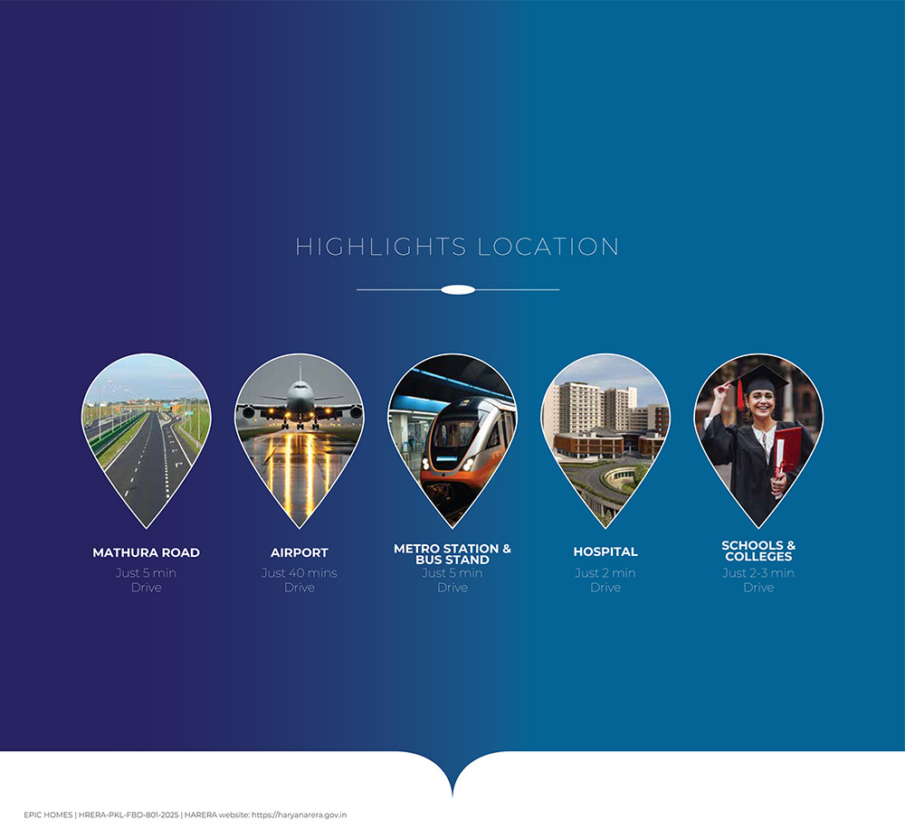 Located in Sector 89, Faridabad, Prosper Epic Homes enjoys 3 and 4 BHK units with excellent connectivity to major parts of Faridabad, Noida, and Delhi NCR. The project is close to schools, hospitals, shopping complexes, and daily convenience facilities. Well-developed road networks ensure smooth commuting to business hubs and employment centers. The fast-growing neighborhood offers strong infrastructure and a peaceful residential atmosphere, making it an ideal location for modern urban living.