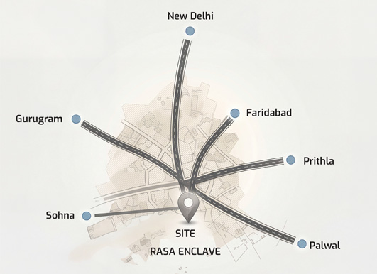 Rasa Enclave enjoys excellent regional connectivity, ensuring smooth access across NCR while remaining away from high-density congestion. Direct access to NH-919 (Palwal–Sohna Road) | Seamless connectivity to NH-44 (Delhi–Faridabad–Agra Corridor) Proximity to Delhi–Mumbai Expressway | Easy access via KMP Expressway (Western Peripheral Expressway) Future connectivity through the proposed Faridabad–Palwal Metro