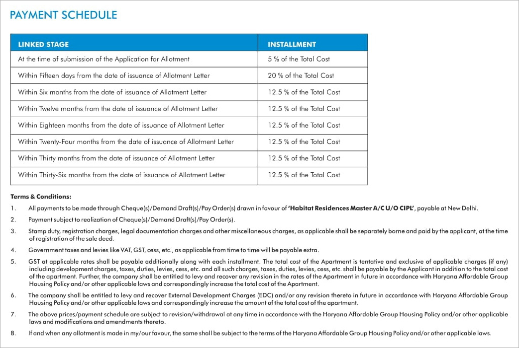 - All payments to be made through Cheque(s)/Demand Draft(s)/Pay Order(s) drawn in favour of ‘Habitat Residences Master A/C U/O CIPL, payable at New Delhi.